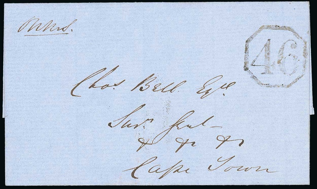 No. 46 (Grahamstown): Undated Official entire to Cape Town showing very fine "46" in Octagon. Photo