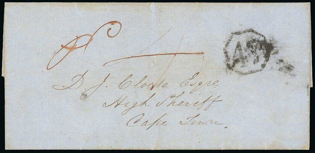 No. 47 (Fort Beaufort): Undated entire to Cape Town, marked "Pd 4" in red ink and showing messy "47" in Octagon. Rare. Photo