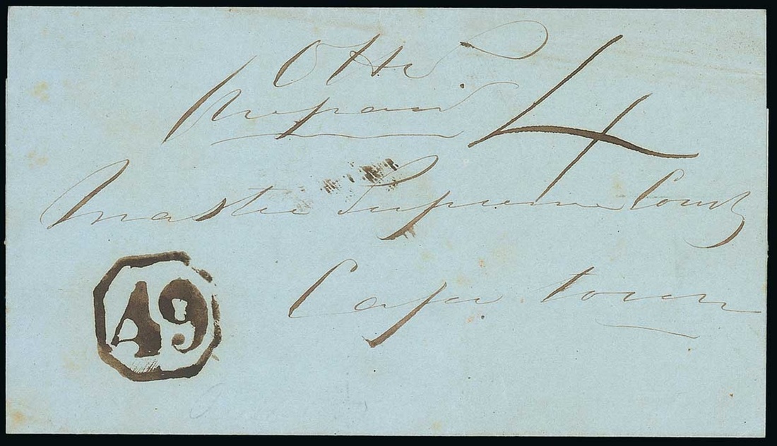No. 49 (Fort Hare): Undated Official entire to Cape Town, marked "Prepaid 4", showing very fine though slightly over-inked "49" in Octagon. Photo