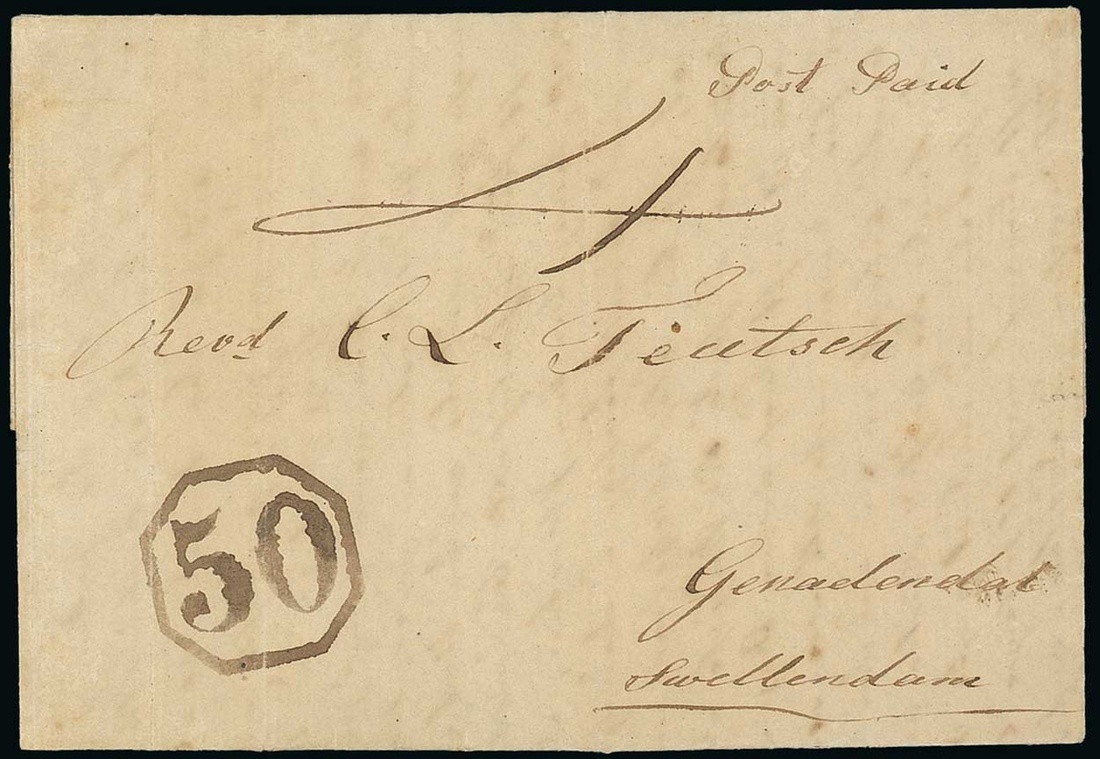 No. 50 (Mamre): 1849 (18 Nov.) entire letter to Swellendam, rated "4" and showing very fine "50" in Octagon. Rare. Photo