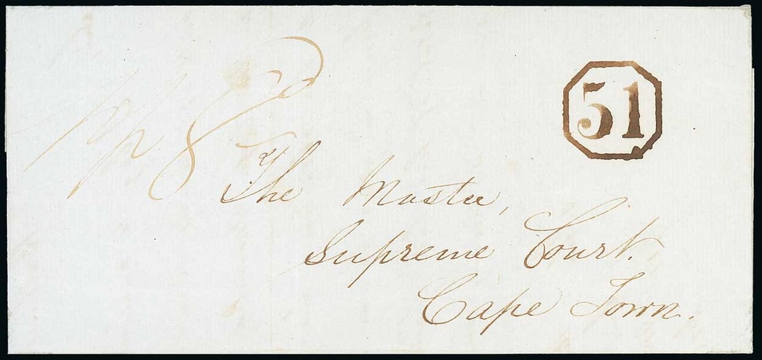 No. 51 (Bathurst): 1850 (1 Aug.) entire letter to Cape Town, marked pp 8d" and showing superb "51" in Octagon. Photo