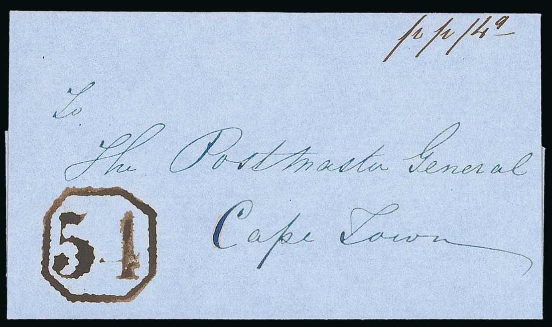 No. 54 (Victoria West): Undated entire to Cape Town, marked "pp 4d" and showing fine "54" in Octagon in brown. Photo