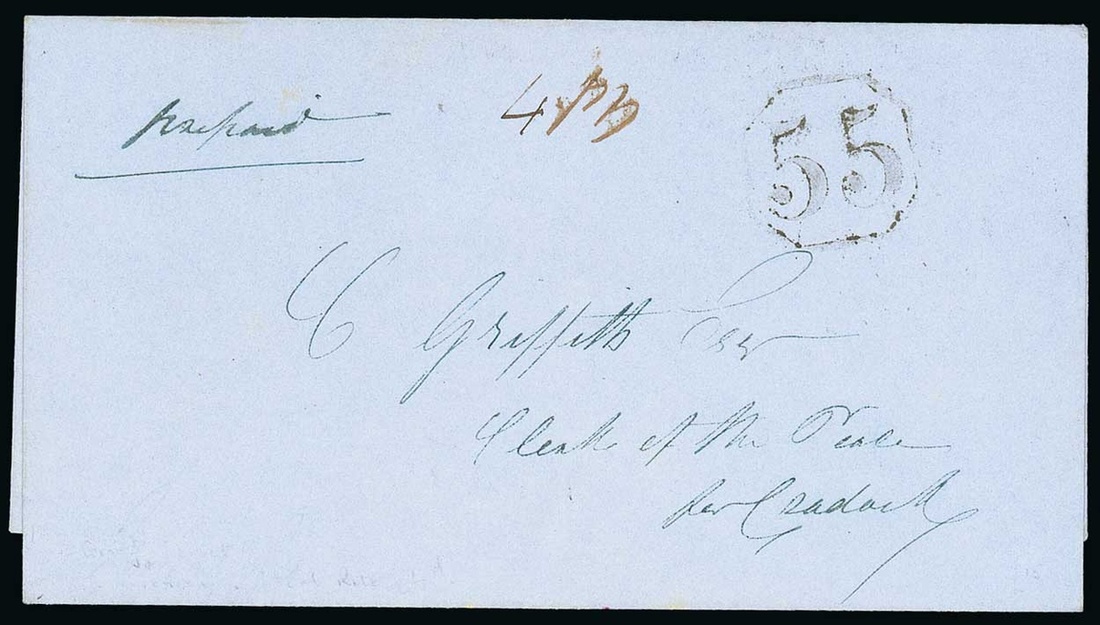 No. 55 (Graaf-Reinet): Undated entire to Cradock, marked "prepaid 4" and showing fine "55" in Octagon. Photo
