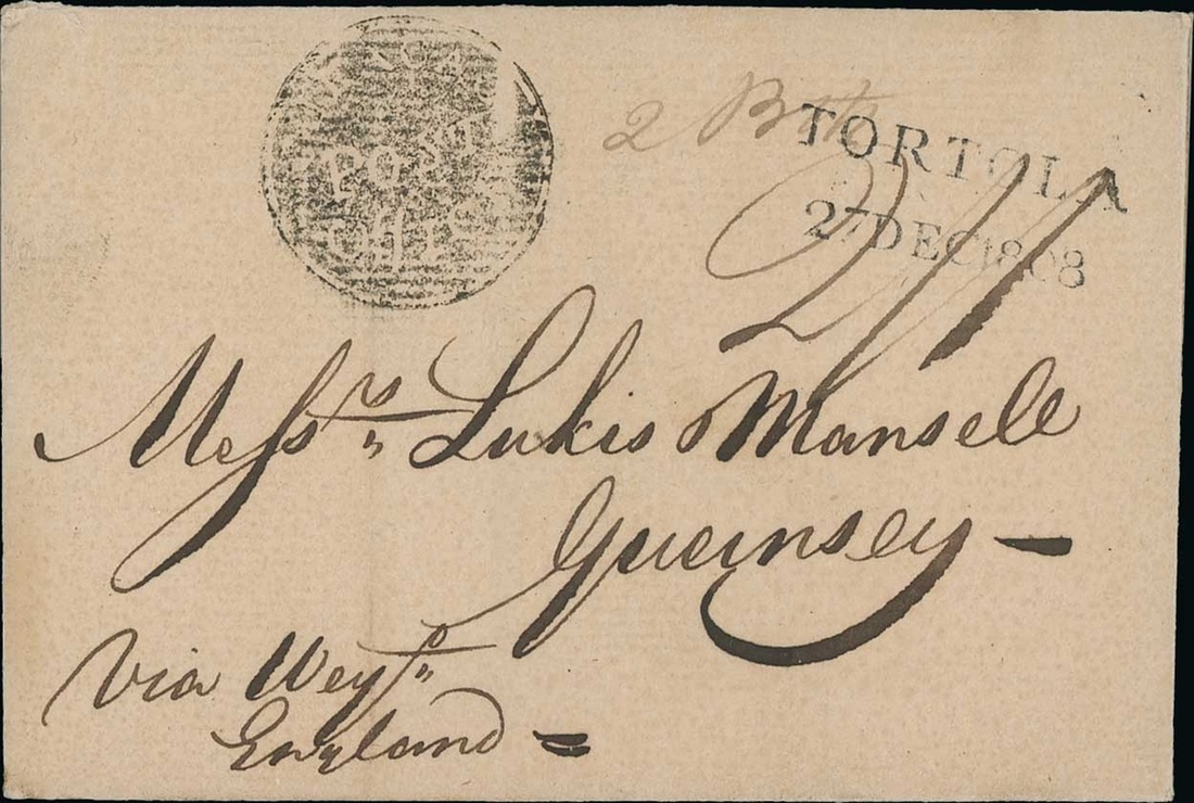 1808 entire to Guernsey, marked "Via Weyh England", rated "2 Bits" and "2/2", showing mainly fine circular intaglio