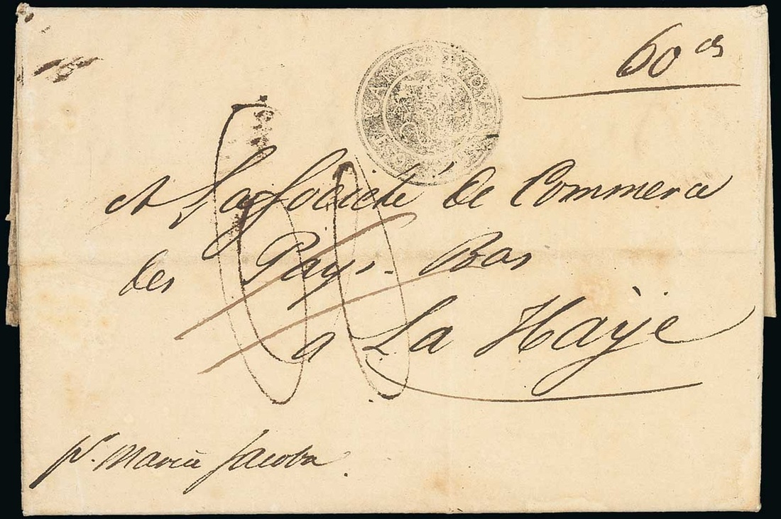 1827 (13 June) entire letter to The Hague, marked "p. Maria Jacoba", rated "60" (deleted) and re-instated, showing fine circular intaglio