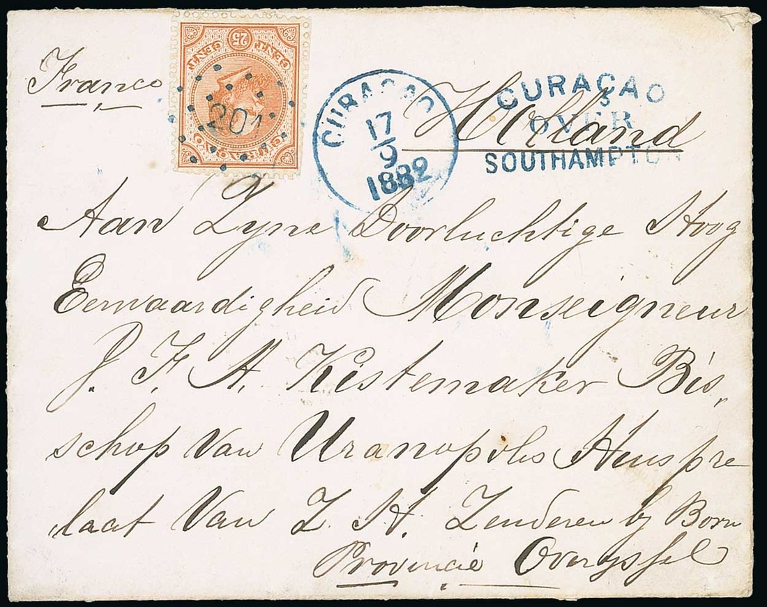 1882 (17 Sept.) envelope to Netherlands, bearing 1873-92 25c. (a few clipped perfs) tied by "201" in diamond of dots with