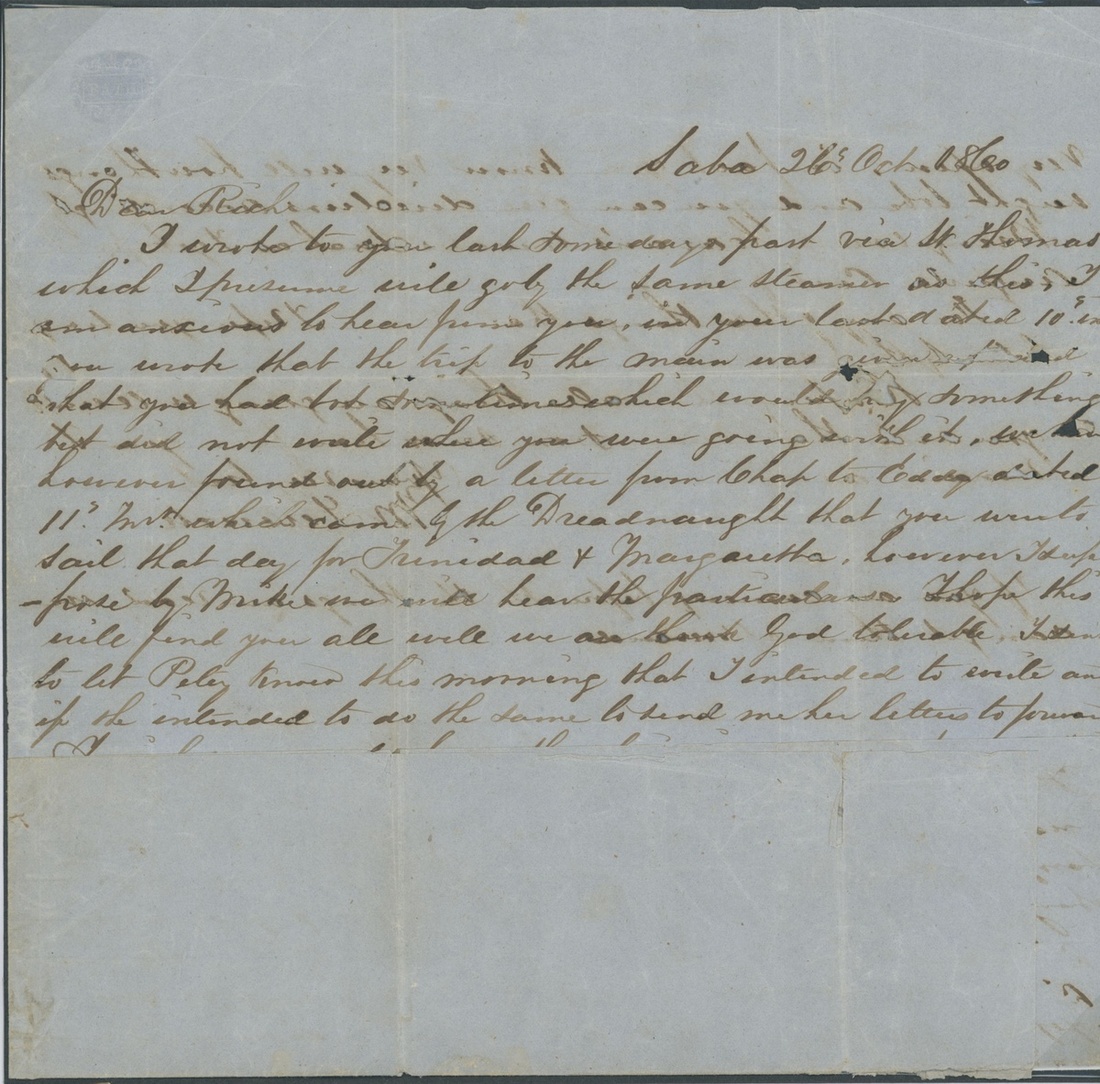 1860 (26 Oct.) entire letter addressed to "Capt. R. Simmons, Schr Casket, care of Messrs Y. Jeffray & Co, Barbados", rated "4" (deleted) and "5" and showing, on reverse, Nevis (12.12) and Barbados (24.12) double-arc datestamps; a little soiled, wear along folds and ink-etching. Rare inter-island mail from this small island