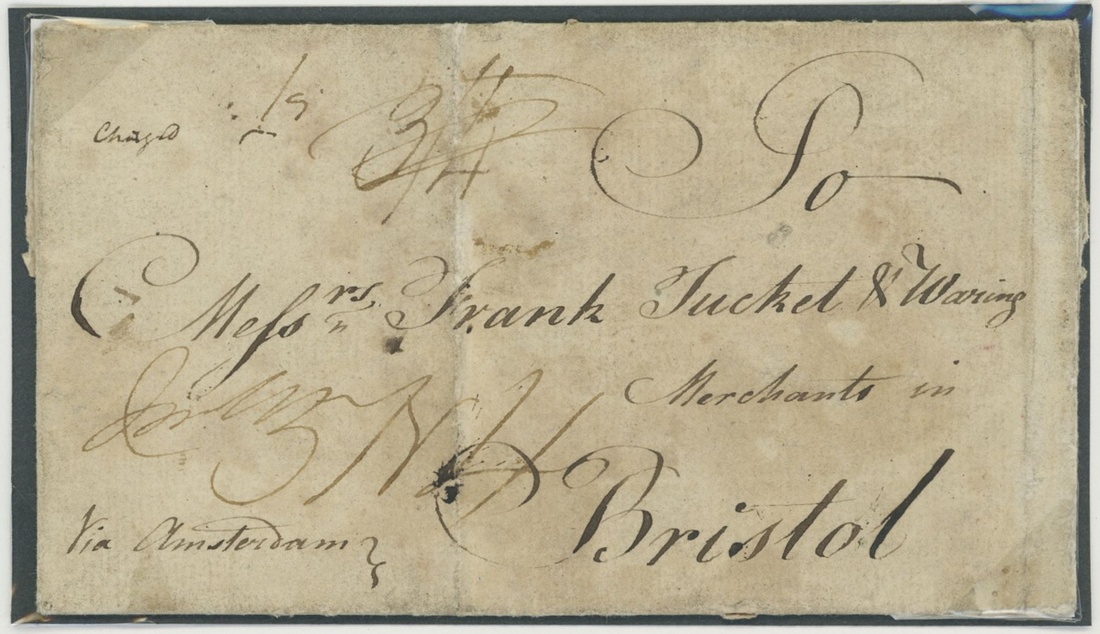 1778 (5 Apr.) entire letter to Bristol, marked "Via Amsterdam", rated "3/4" (deleted) and "5/4" and showing arrival Bishopmark (8.6) on reverse; lightly stained