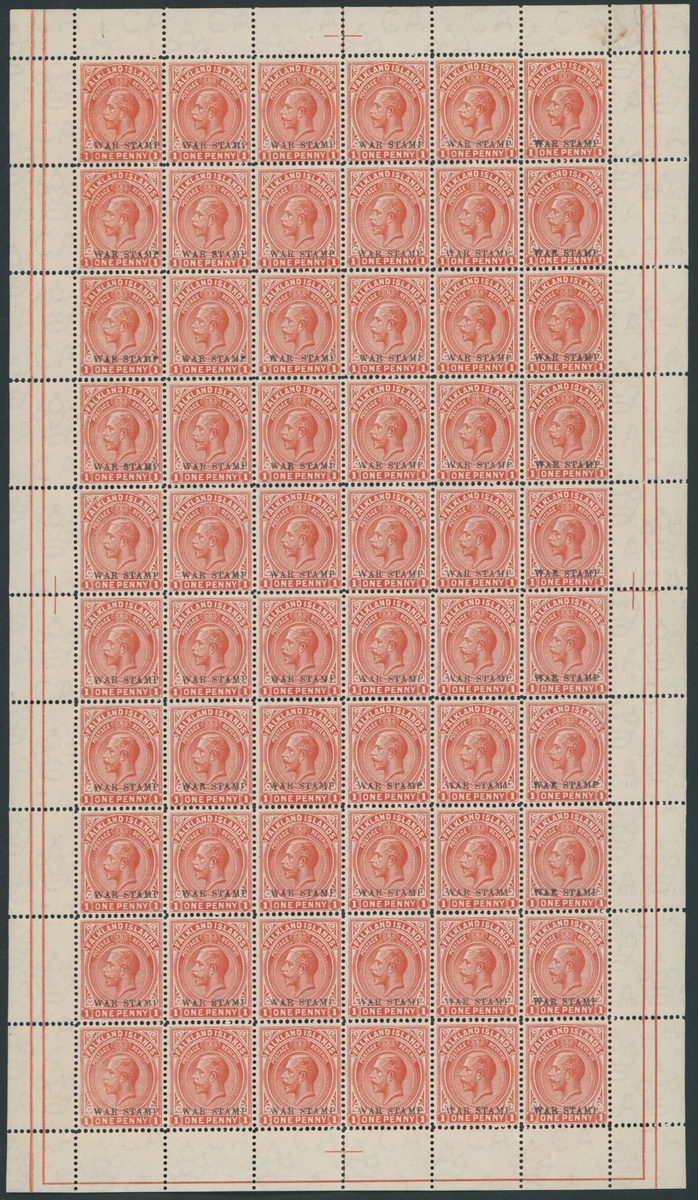 1918-20 War Stamp, Setting 1, 1st printing 1d. pale scarlet complete sheet of sixty showing reversed albino overprint in right hand margin, fresh mint and mounted in the selvedge only; a few split perfs.