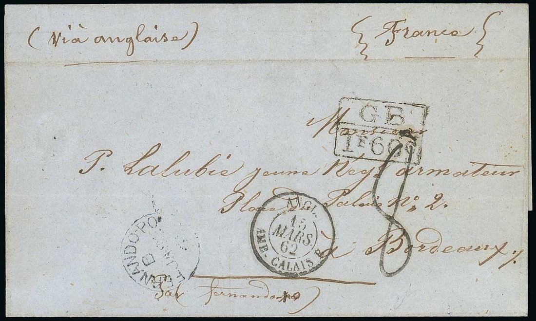 1862 (8 Jan.) entire (filing crease at top) from Gabon "(Via anglaise)" to Bordeaux, with good