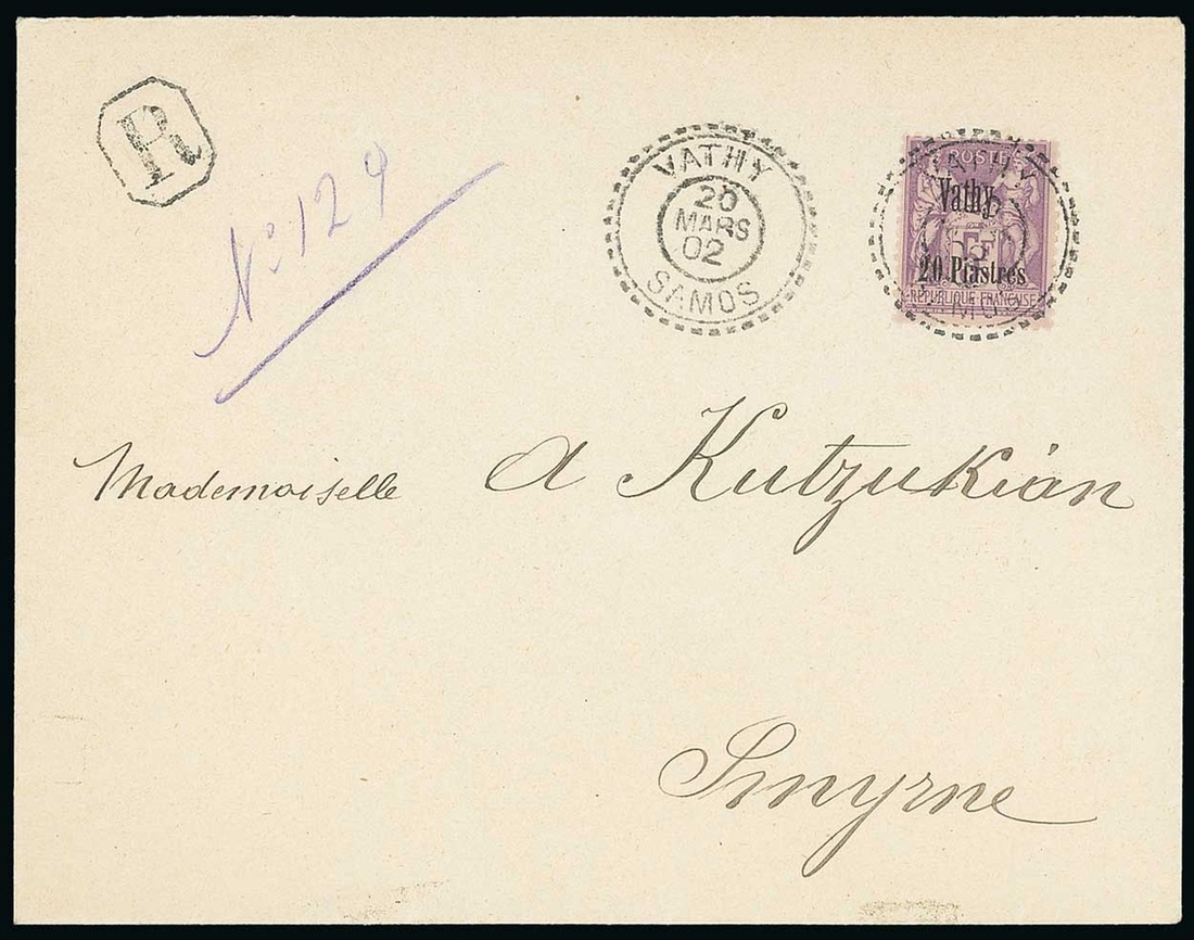 1892-1900 20pi. on 5f. mauve tied by Vathy/Samos c.d.s. on 1902 (30 Mar.) envelope registered to Smyrne; fine. S.G. 91. Photo