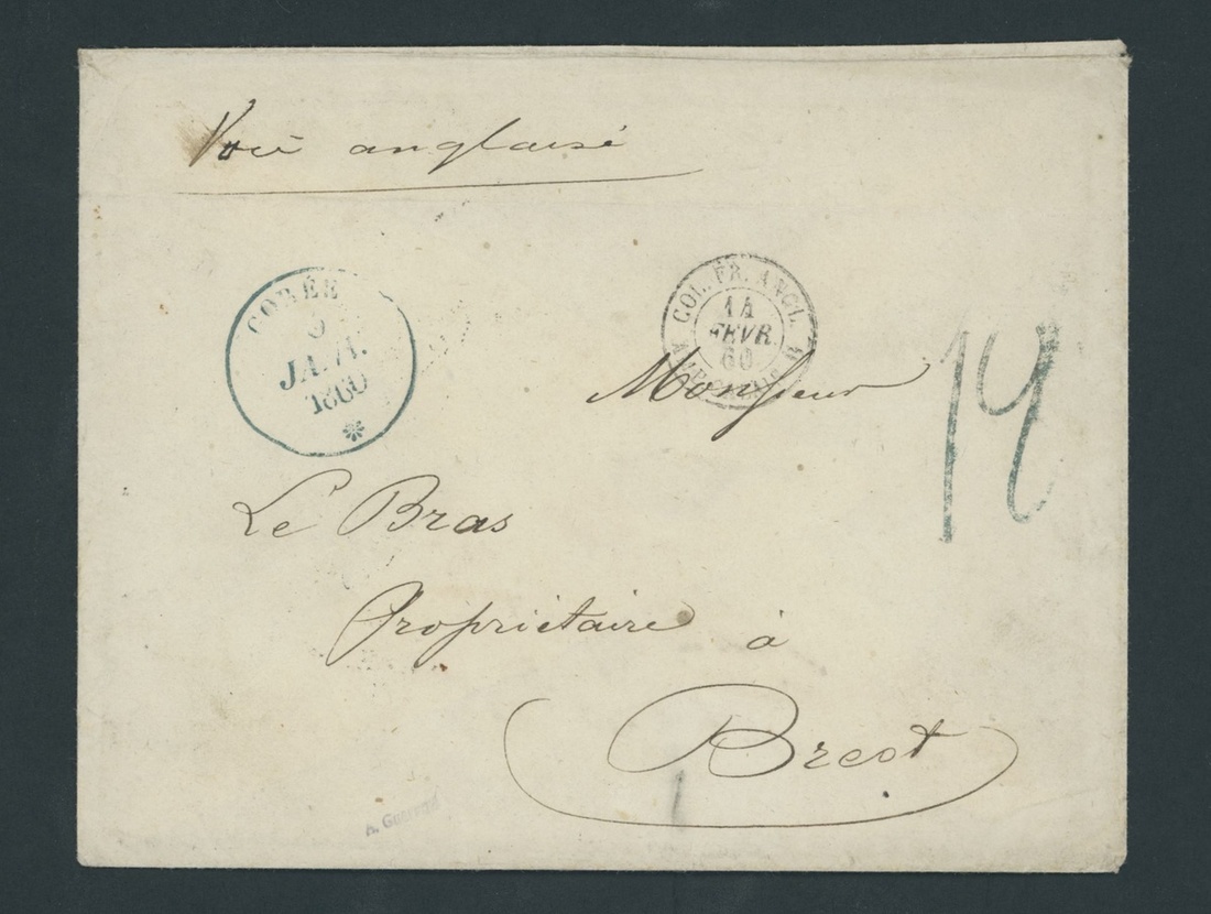 1860 (3 Jan.) envelope Voie Anglaise to Brest with blue Goree d.s., matching "12" rate mark and