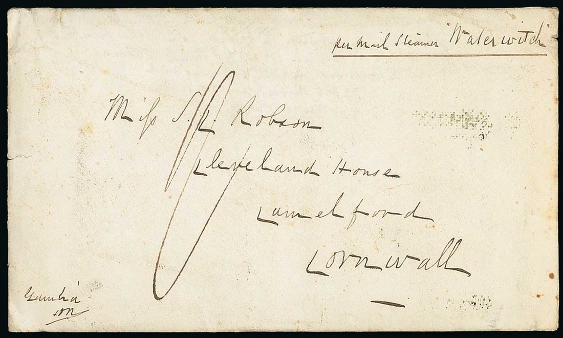 1854 (24 June) envelope with enclosure, ex the Robson correspondence per Mail Steamer "Waterwitch" to Cornwall, on reverse red Plymouth (3.7.) and yellow Camelford (4.7) datestamps; an interesting note on the flap states that the sender had received a letter from his sister dated Oct. 1852, delayed as it was missent to Bathurst New South Wales and making the suggestion that 'Bathurst' be left out of the address in favour of 'River Gambia, West Africa'; fine. This was the last letter written by H. Robson before his death from yellow fever on 24 June 1854. Photo