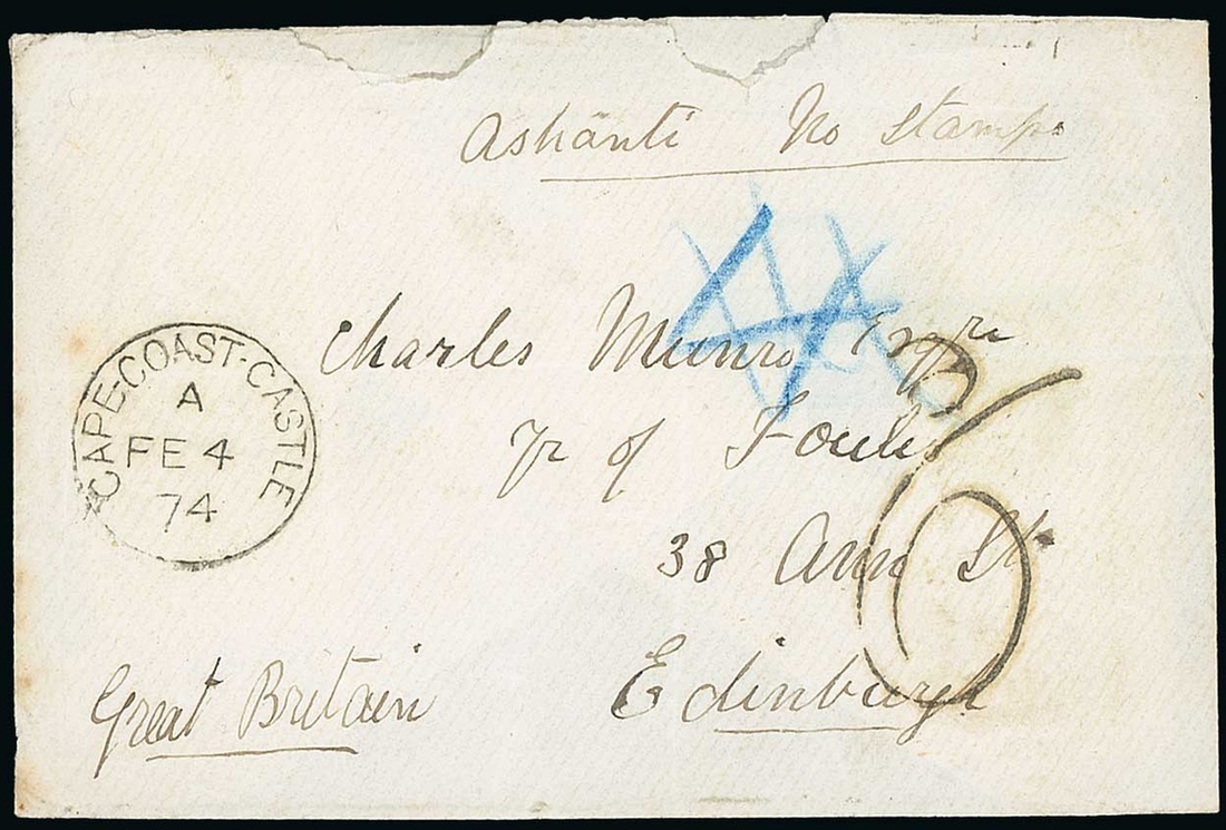 1874 (Jan.) Ashanti Wars stampless envelope to Edinburgh with "Stamps not procurable", manuscript rate "4" in blue crayon corrected to "6" in ink and bearing Cape Coast Castle transit c.d.s. (8.1), the reverse with Edinburgh arrival (1.2); a little roughly opened at foot. A very early letter from this campaign (the troops only began their march on 1st January) and later mails were marked in Liverpool with the handstruck 6d. rate mark. Photo