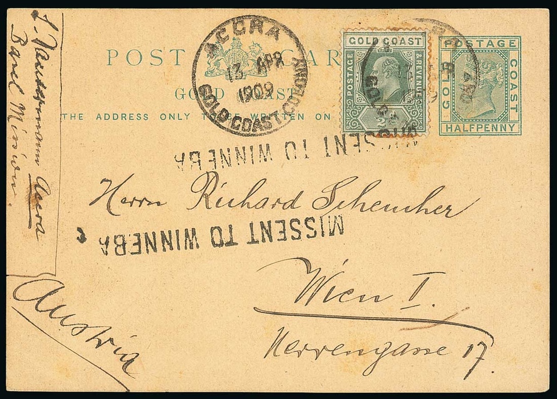 1909 (13 Apr.) Q.V. ½d. stationery card to Austria, uprated with K.E.VII ½d. tied by Accra c.d.s. and bearing two strikes of the straight-line "