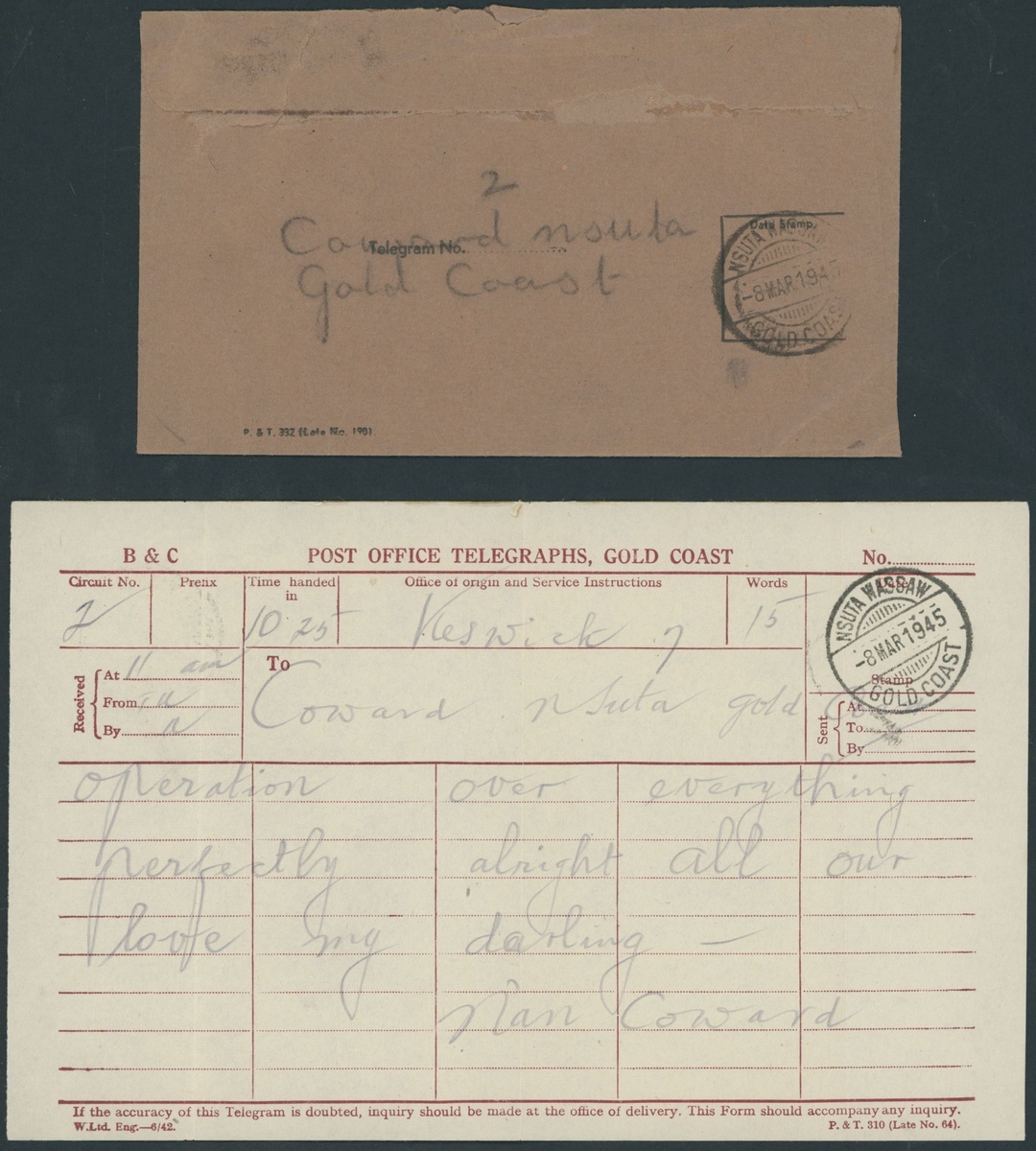 Telegram: 1945 (8 Mar.) telegram and envelope, both cancelled by fine strikes of Nsuta Wassaw c.d.s. with the message sent from Keswick. Unusual