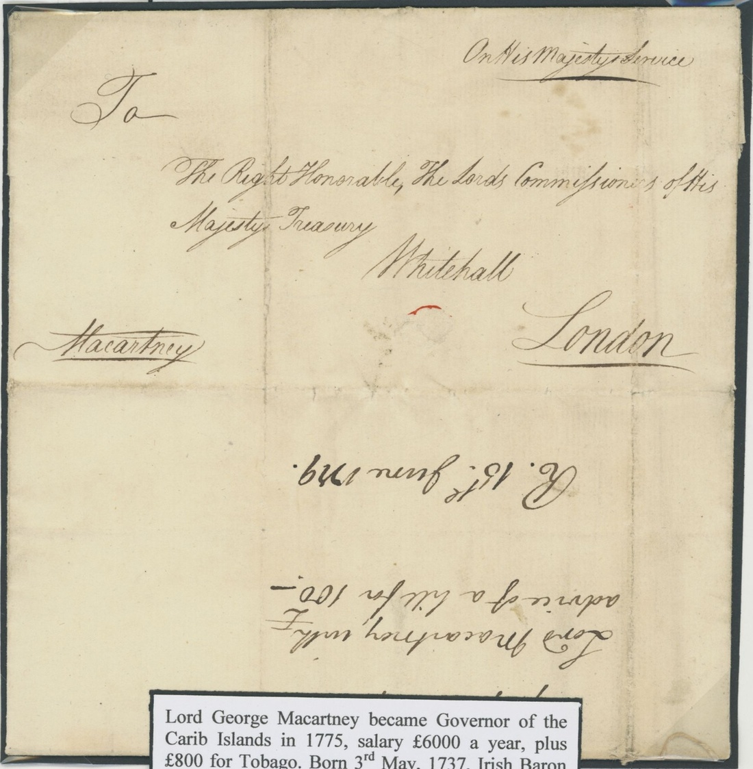 1779 (17 Apr.) entire letter from Lord George Macartney, Governor of the Carib Islands, addressed to the Treasury, Whitehall, headed "On His Majesty's Service" and signed "Macartney" at lower left