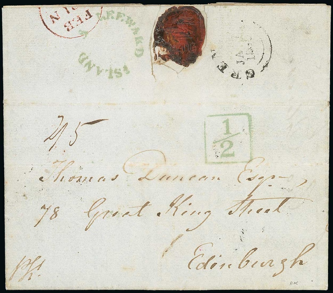 1839 (4 Jan.) entire letter to Edinburgh, rated "2/5", showing boxed "½" in green with, on reverse, Grenada double-arc d.s. and very fine undated