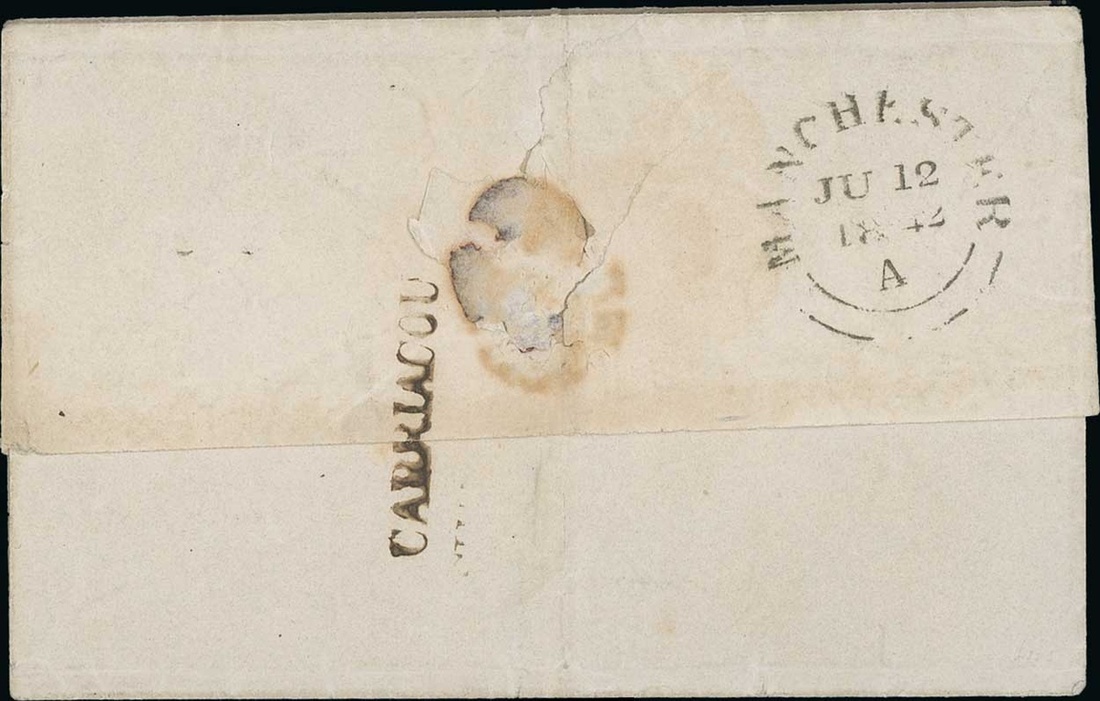 1842 (30 Apr.) entire to Chester and re-addressed to Manchester, rated "1/-" (deleted) and "1/1" and showing, on reverse across join, fine straight-line