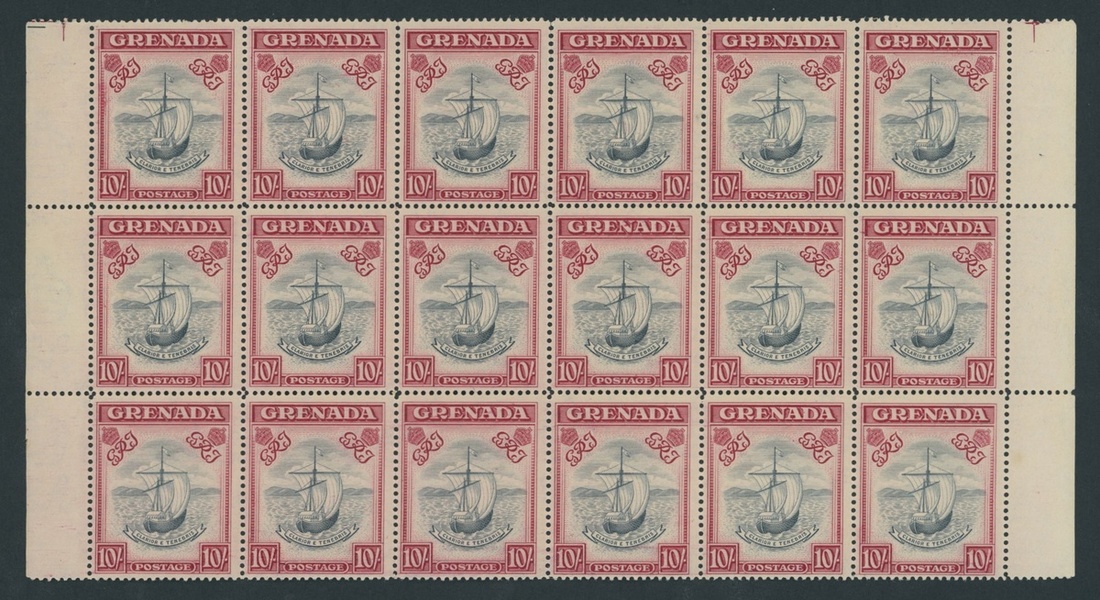 1938-50 10/- blue-black and carmine, perf. 14 (narrow) block of eighteen (6x3), unmounted mint; slightly gum toned, a few split perfs. and gum crease affecting two. S.G. 193e, £900