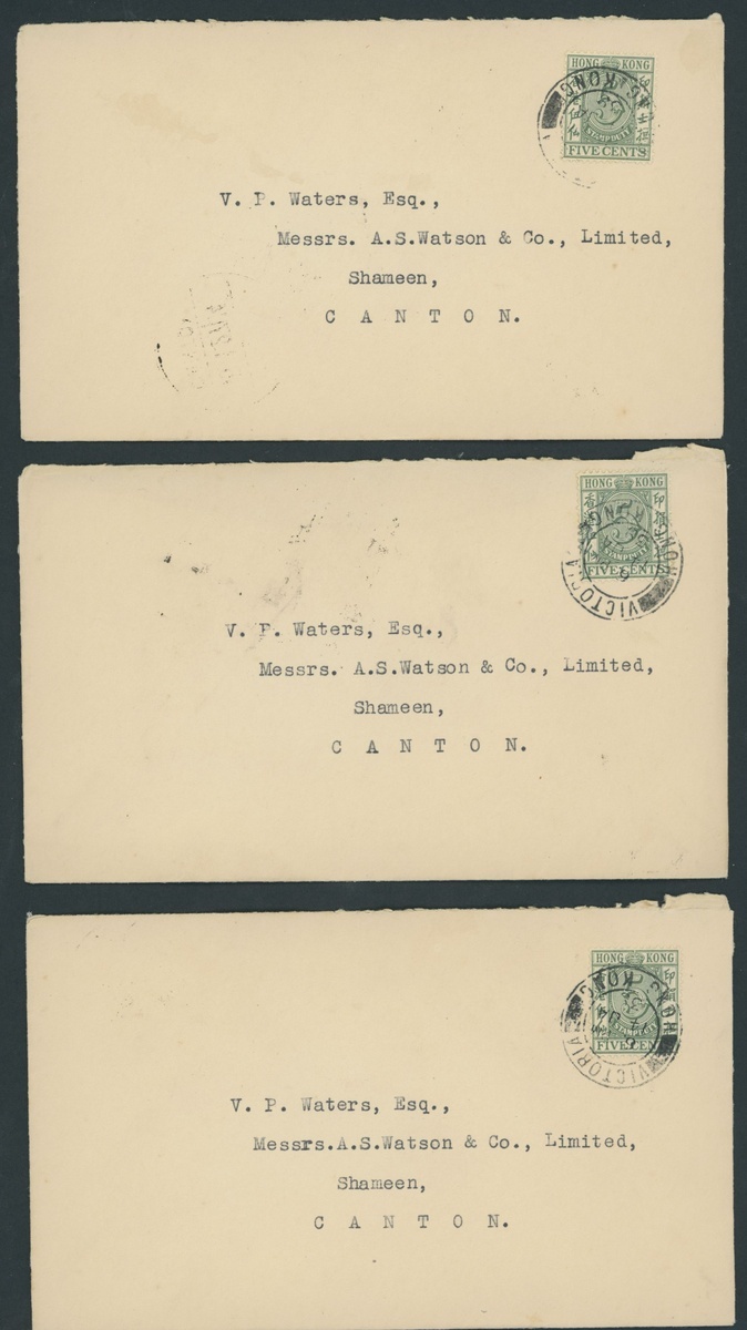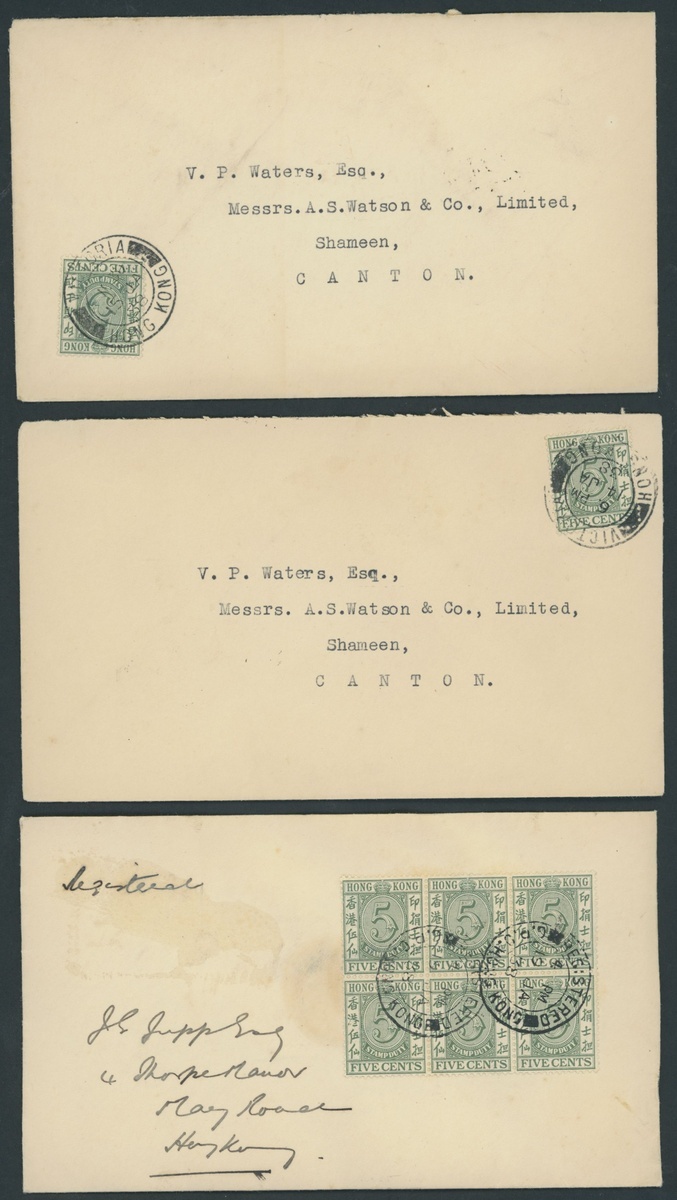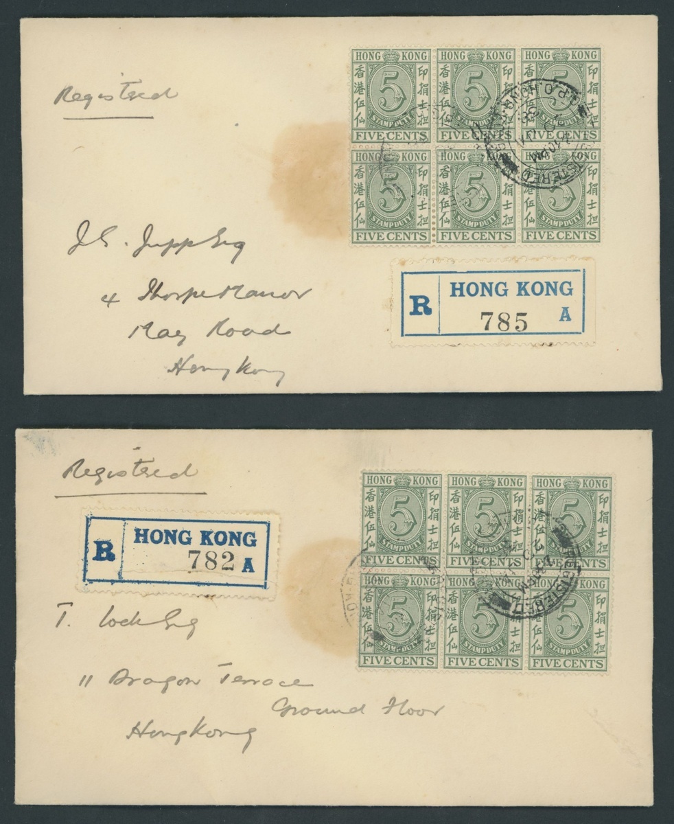 A group of covers (8) with 14 Jan. single frankings to Canton (5) with arrival backstamps and 19-20 Jan. local registered covers (3), each bearing a block of six and registration label. Generally fresh