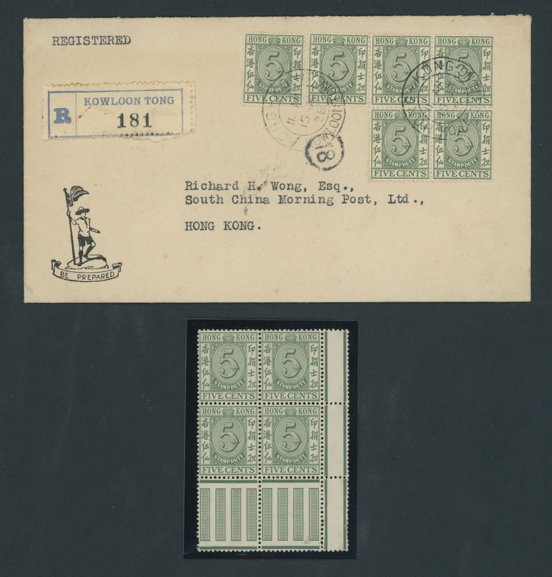 A corner block of four, mounted in the margin only; also six examples on 1938 (15 Jan.) local registered Scouting envelope; fine