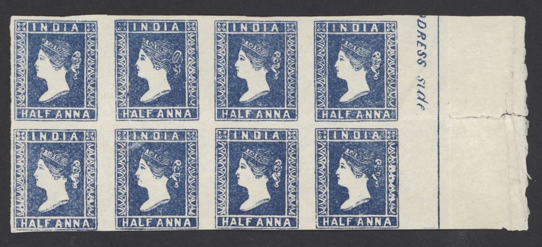 ½a. deep blue Die I "A" Stone marginal block of eight, [80-88], with wide sheet margin at right and close to good margins elsewhere, fresh unused; split in margin clear of the sheet frameline, otherwise fresh and fine. S.G. 4. Photo