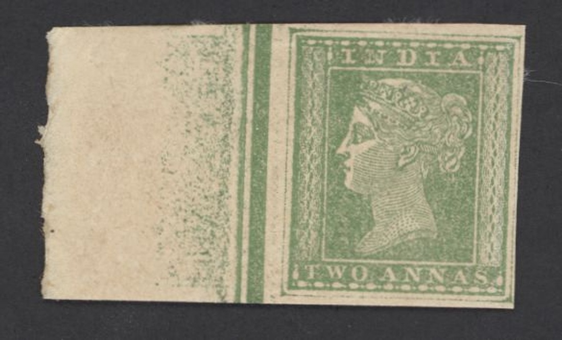2a. green, marginal from the left of the sheet and with three other good to large margins and unusually showing "extra" framelines all round, unused; a fraction toned and a couple of small marks on reverse, otherwise sound. S.G. 31, £350. Photo