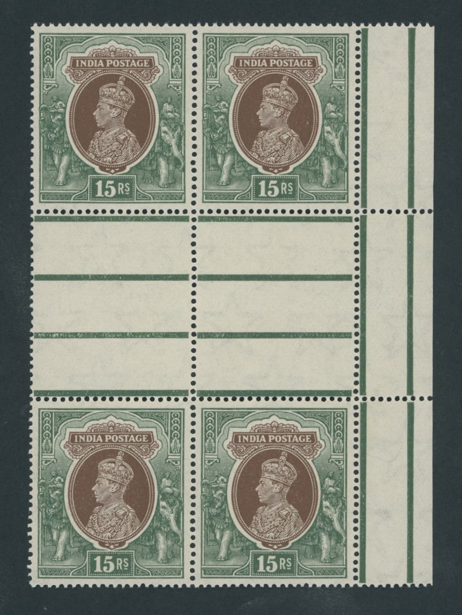 1937-40 15r. brown and green interpanneau block of four from the right of the sheet, fresh unmounted mint. S.G. 263, £720+