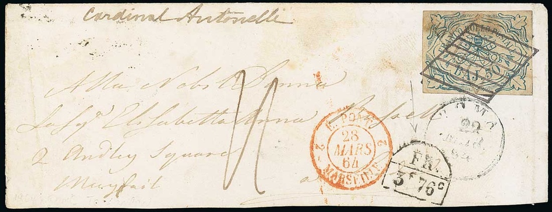 1852-64 50b dull blue, margins all round, tied by two strikes of the Lozenge cancellation on 1864 (22 Mar.) envelope to London, "FR/3f.76c" accountancy marking below; some staining. S.G. 27. Photo