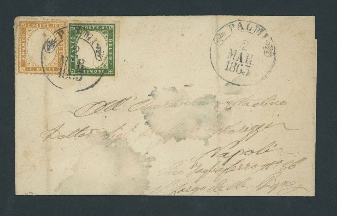 1855-65 5c. deep green used with Italy 1862 10c. on 1863 (2 Mar.) entire to Naples, Palmi cancellation; vertical crease affecting the 10c., somewhat stained and water stained though a scarce combination