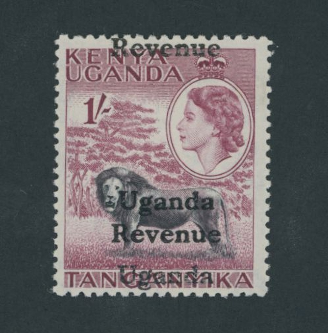 1954 overprinted "Uganda/Revenue" 1/- black and red, variety overprint double, fresh mint. Scarce. Barefoot 142a