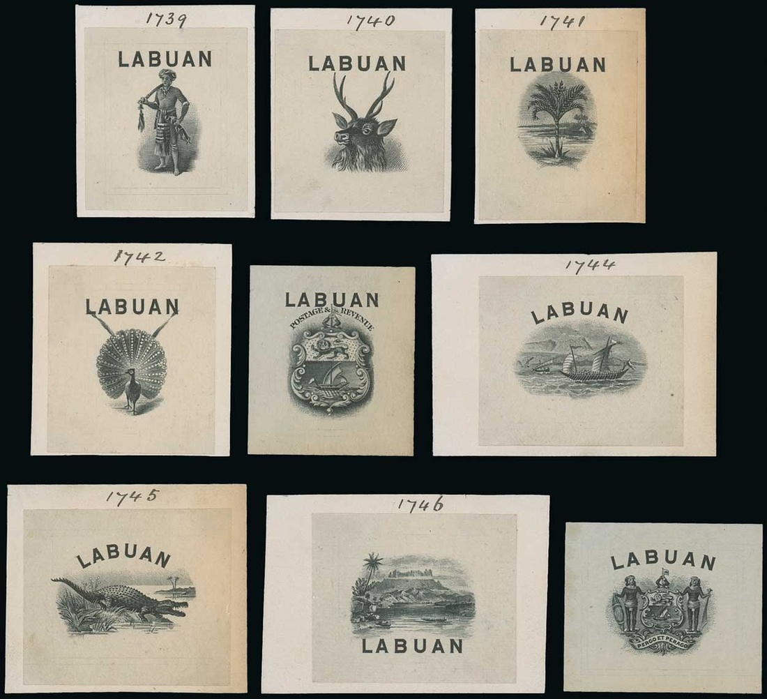 1c. to 24c. "clean" set of nine vignette die proofs, each a little larger than stamp-size on wove paper with all but the 6c. and 24c. affixed to pieces of card with the die number written above; the 3c. a little toned at right though unique in this form and most attractive. Photo