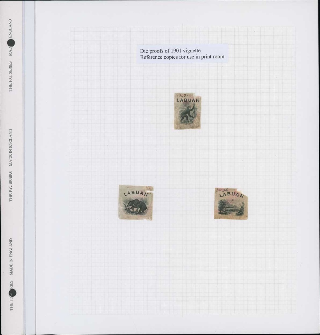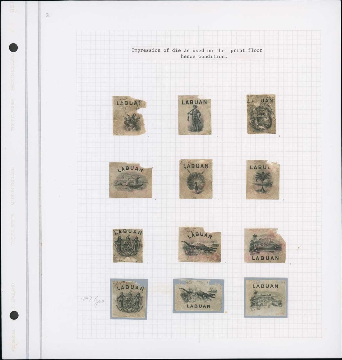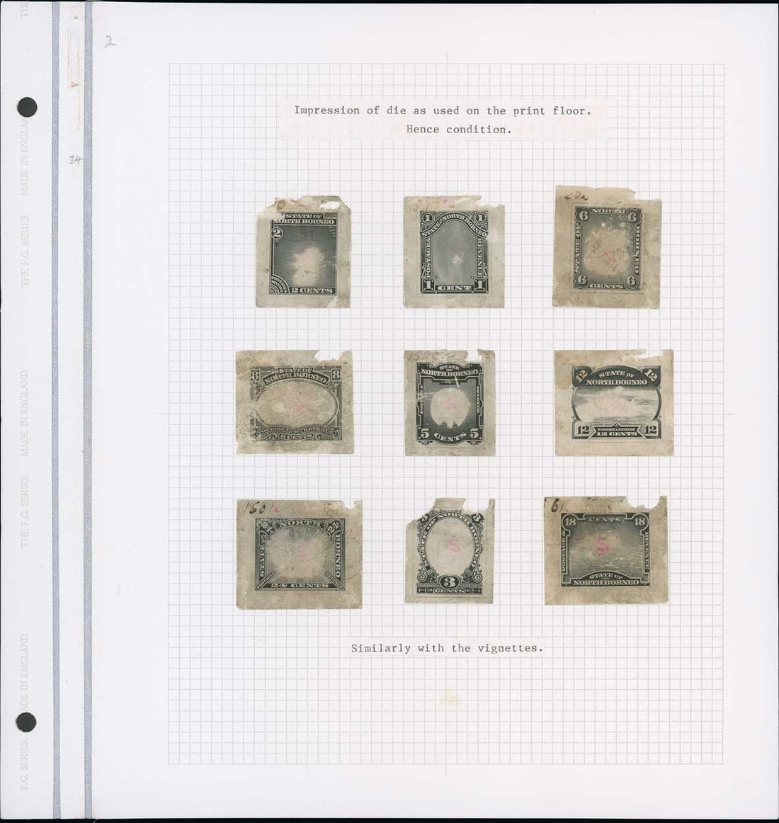 1c. to 24c. "working" set of nine vignette die proofs, accompanied by the North Borneo frames set of nine, together with similar vignette 1897 12c., 18c., 24c. and 1900-02 4c., 10c. and 16c., all on wove paper with a few showing traces of die numbers; all very soiled/rubbed with portions missing in places though a very rare group, being the only working proofs of these issues and accompanied by a few of the North Borneo mint stamps (14). Photo