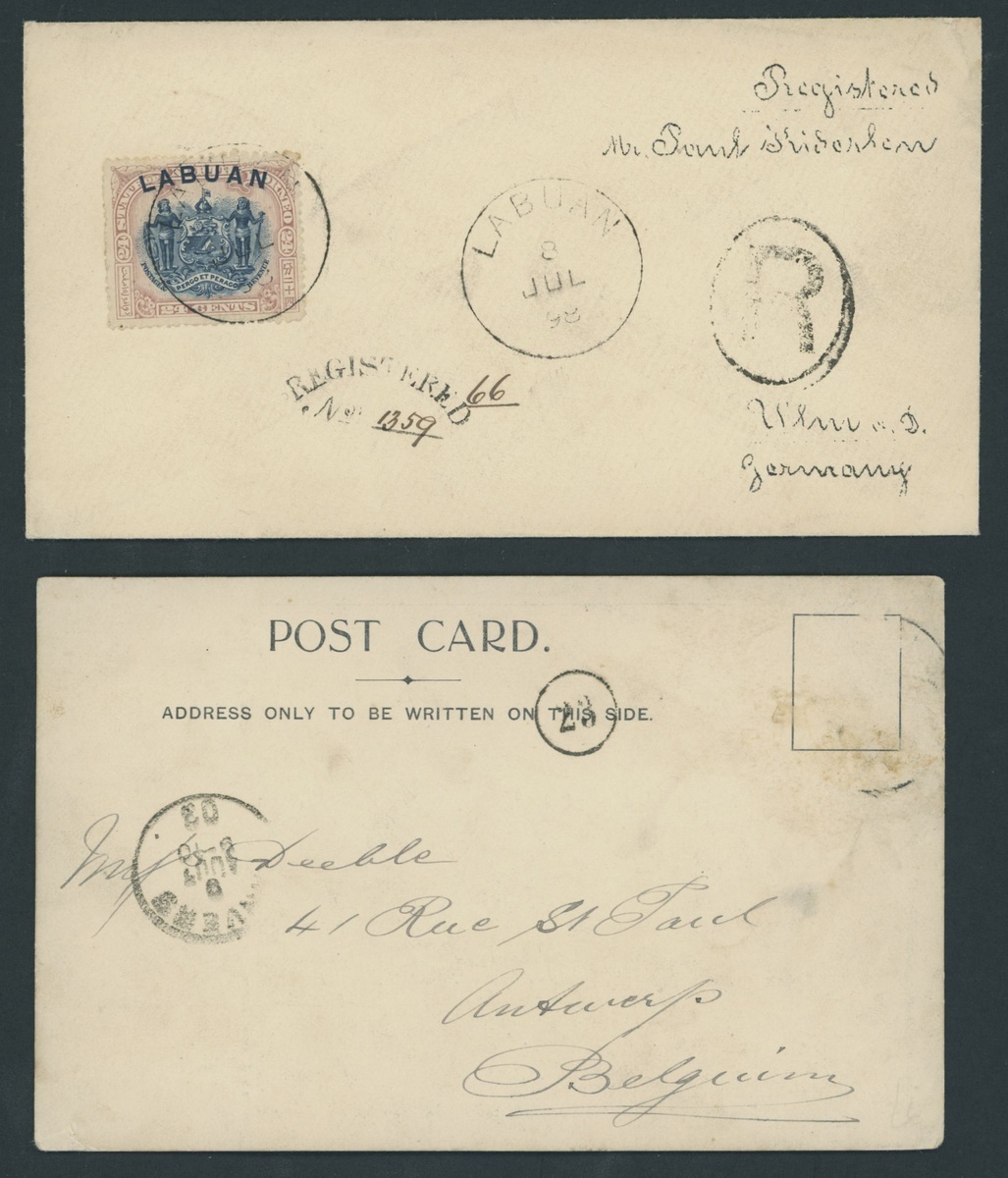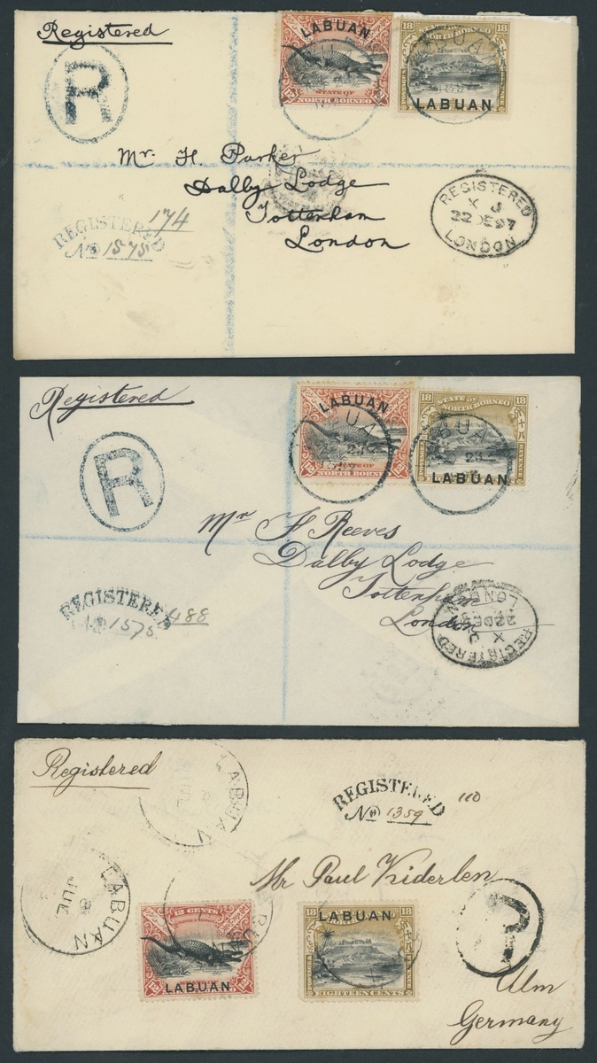 1897-98 envelopes registered to philatelists (4), two bearing 12c. and 18c., one with 24c. and one with 1897 12c. and 18c., all cancelled with datestamps in black or blue-black and with despatch and arrival registration marks and datestamps; one 18c. defective though generally good to fine. Also 1903 View at Labuan card (stamp removed) to Belgium