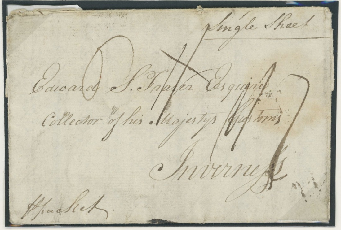 1791 (20 Feb.) entire letter to Inverness, marked p. packet", rated "1/-" (deleted) and "1/7" and showing, on reverse, London (25.4) and Edinburgh (28.4) transit datestamps; slightly soiled and with some splitting along folds