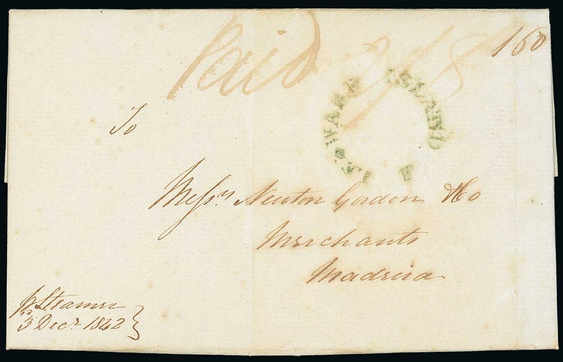 1842 (3 Dec.) entire letter to Madeira, marked "Paid 2/8" and "160" (reis), and showing very fine circular undated