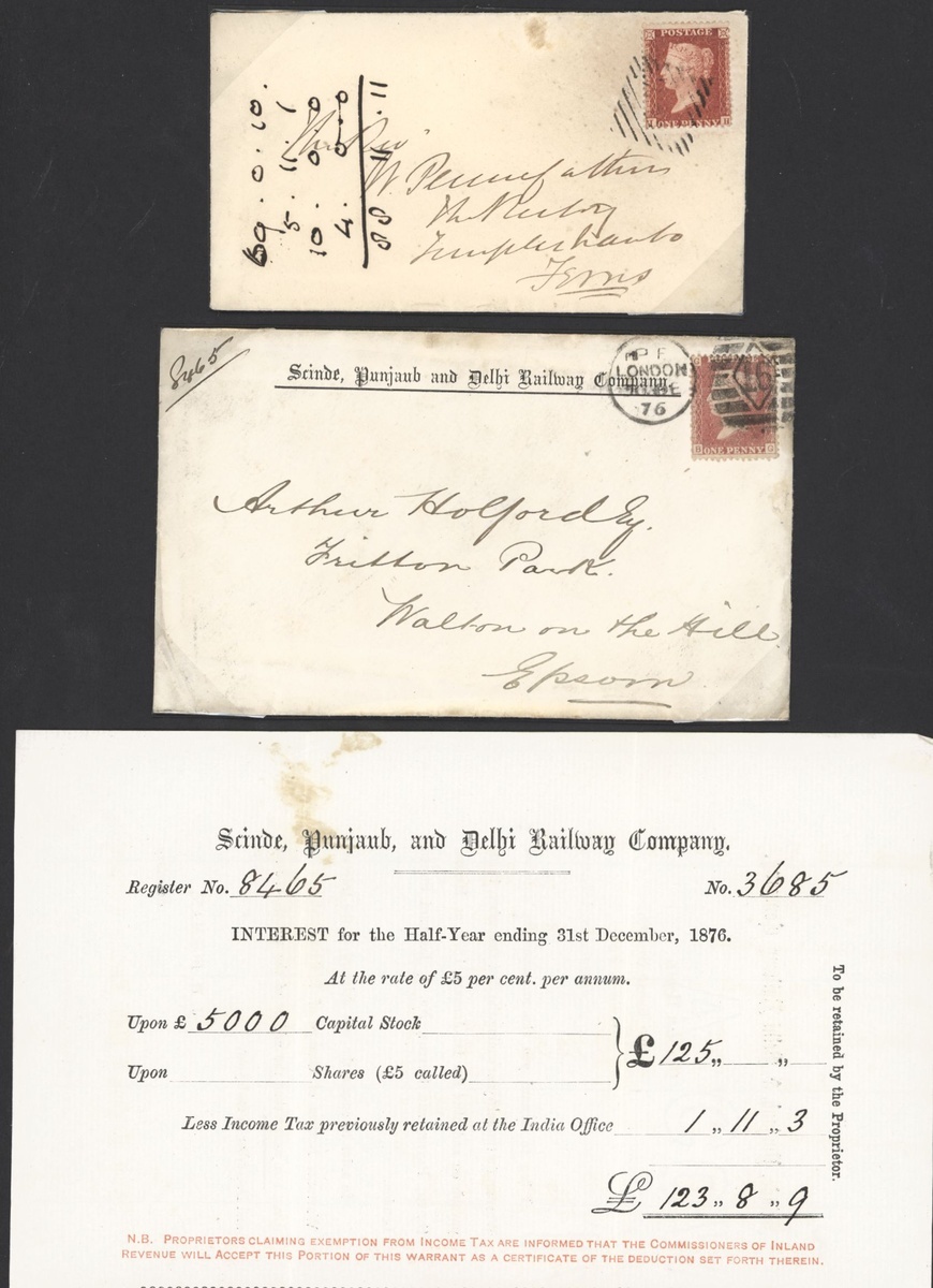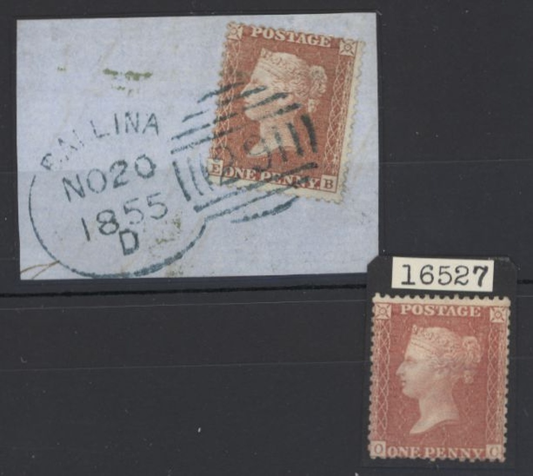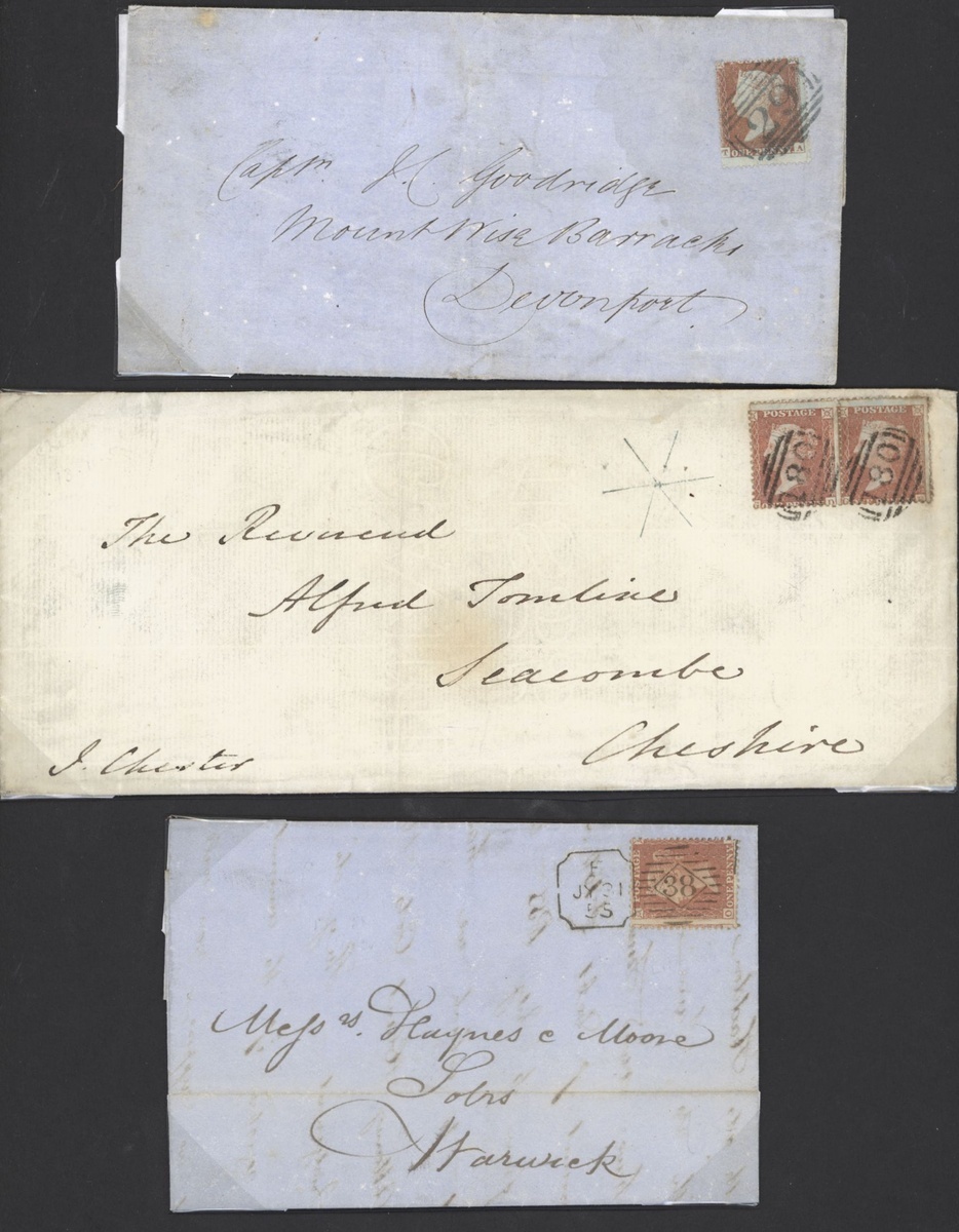 1855-76 selection of eight entires and a piece all franked with 1d., comprising 1855 to Devonport with superb blue "29" barred oval of Ashburton (rare on a cover bearing a perforated 1d.), piece with blue Ballina "29" spoon, 1856 to Cheshire bearing pair with "180" barred ovals of Chester with unusual "Sputnik" Inspectors mark, 1855 and 1856 entires with indented London "38" late mail duplex cancellations, 1859 to Shrewsbury with superb London "4" trial duplex, 1860 to Broadway with "611" duplex of Pershore and "2" handstamp alongside, 1861 with unusual square shaped "243" in diamond of Gorey, 1876 "Scinde, Punjuab and Delhi Railway" Company envelope from London to Epson, also 1856-58 1d. unused with B.P.A. Certificate (1951). An interesting group