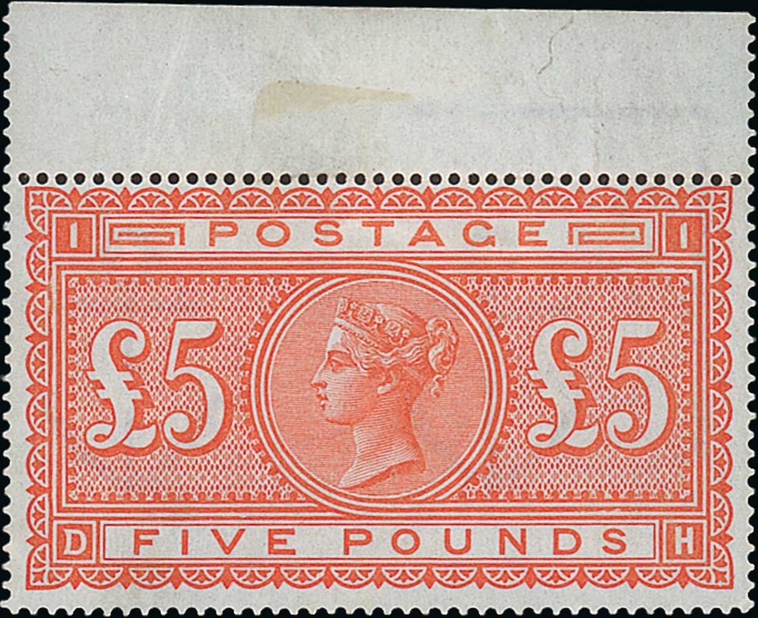 £5 orange, DH, marginal, good strong colour, mounted in the margin, the stamp remaining unmounted; some gum creasing, otherwise fine. S.G. 137, £14,500. Photo
