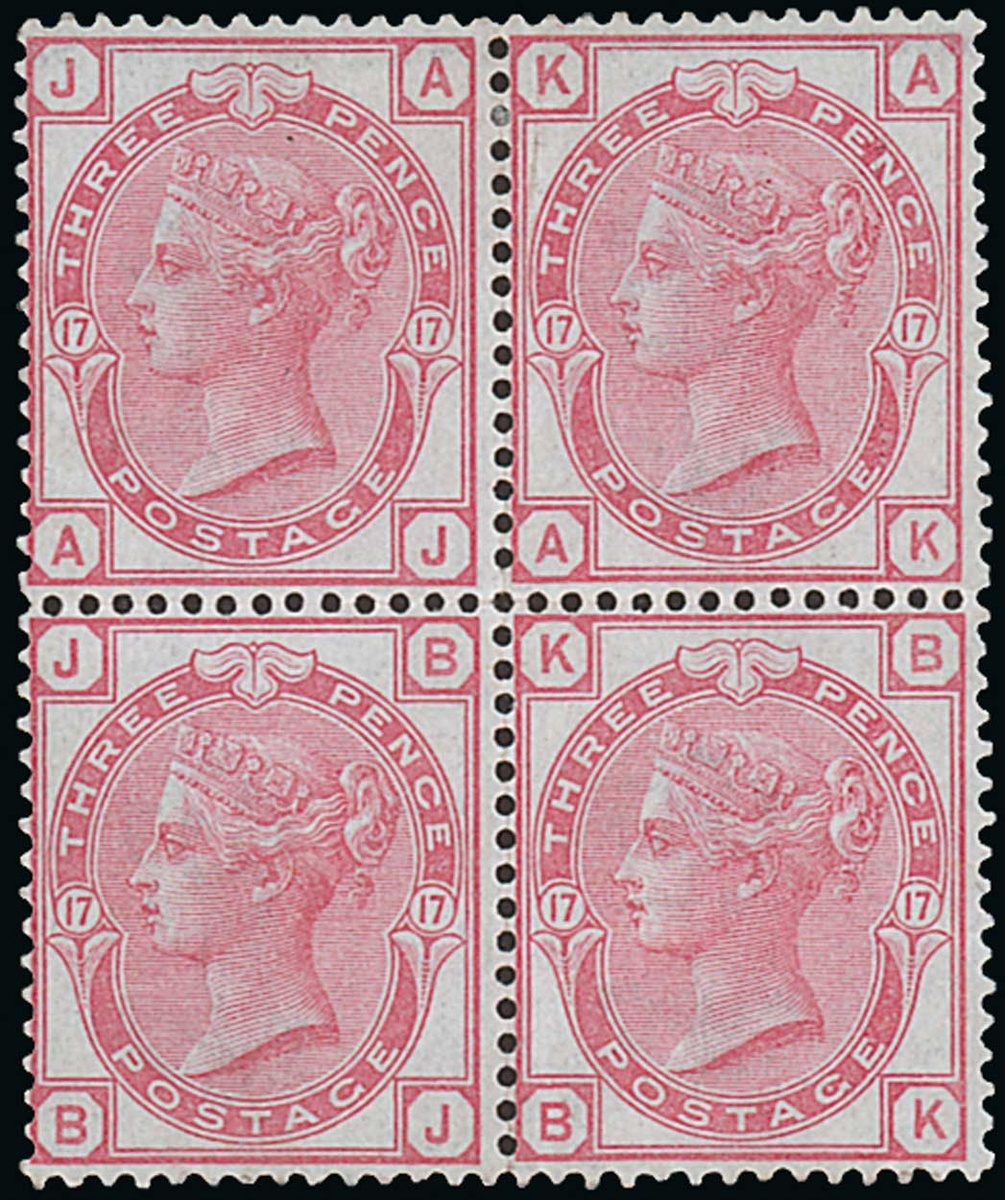 1873-80 3d. rose Plate 14: AJ-BK block of four, large part original gum; fresh and fine. S.G. 144, £2,100+. Photo