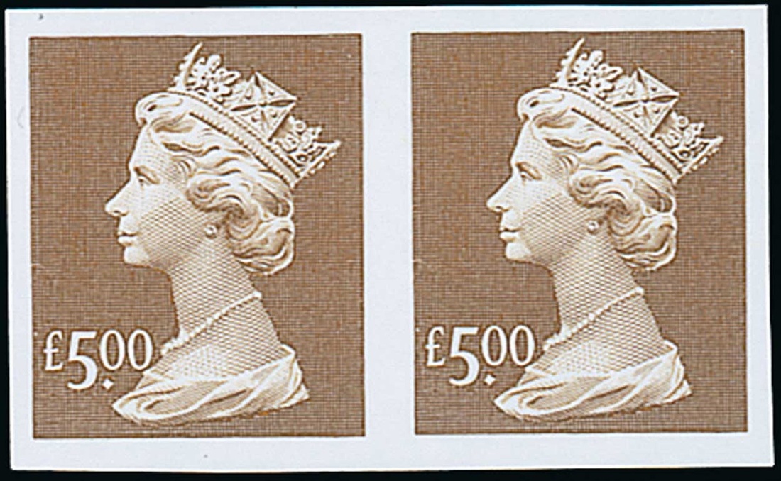 Engraved £5 brown imperforate horizontal pair, unmounted mint; fine. Brandon Certificate (2007). S.G. Y1803a, £950. Photo