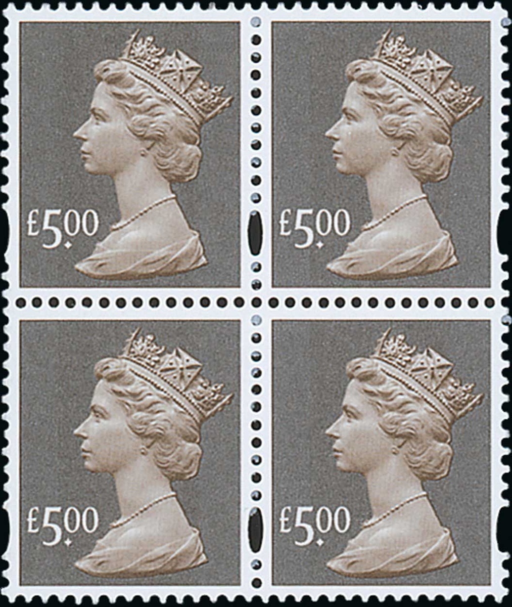 Engraved £5 brown block of four, error printed in Iriodin ink unmounted mint, fine and extremely rare. It is believed that only twenty examples are recorded. S.G. Y1803var. Photo