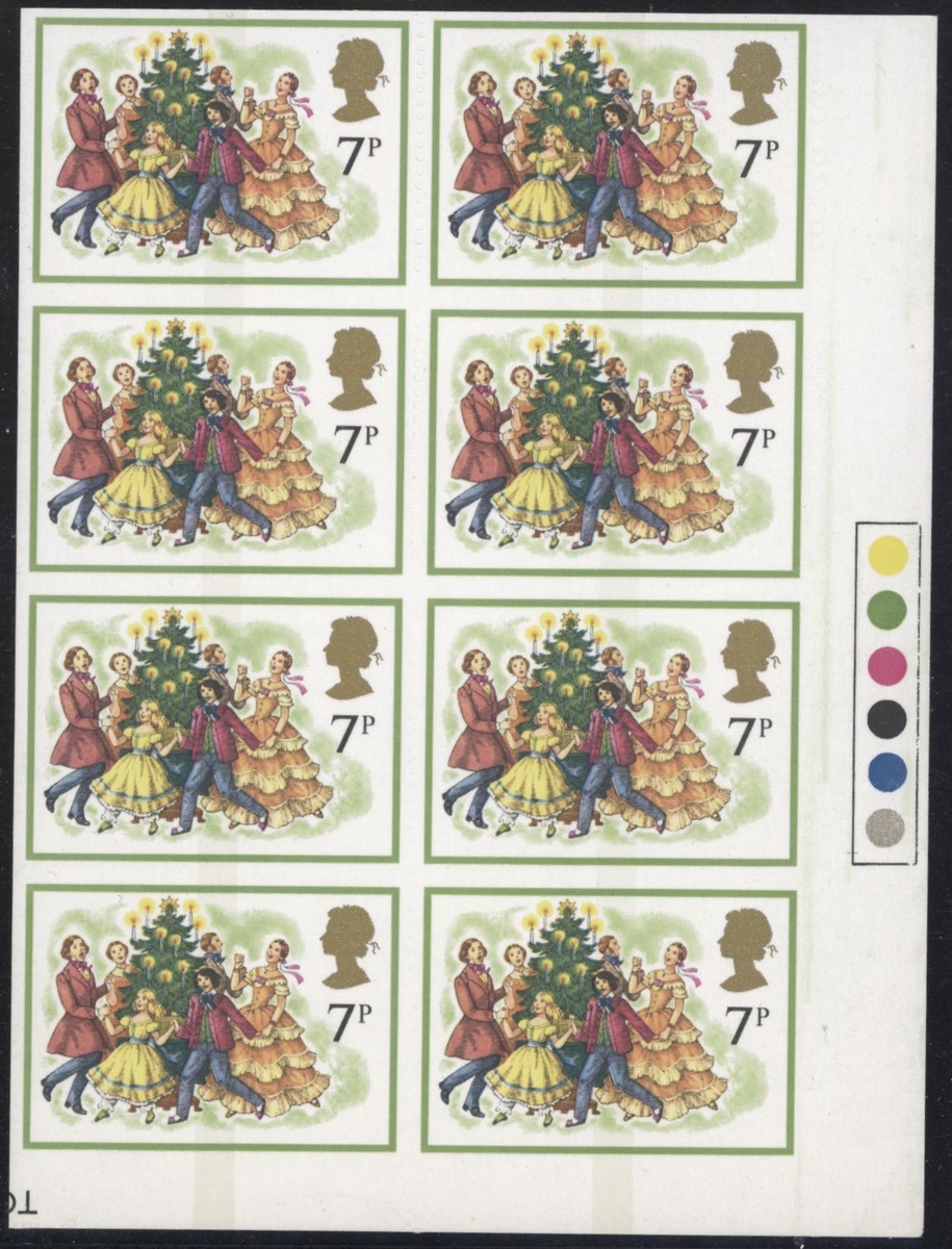 1978 Christmas, 7p. Singing Carols around the Christmas Tree block of eight (2x4) from the lower right corner of the sheet with traffic lights, variety imperforate between stamp and margin at foot and with ghosted perfs. affecting the remainder of the block; unmounted mint, fine. Brandon Certificate (2006). S.G. 1071var.,