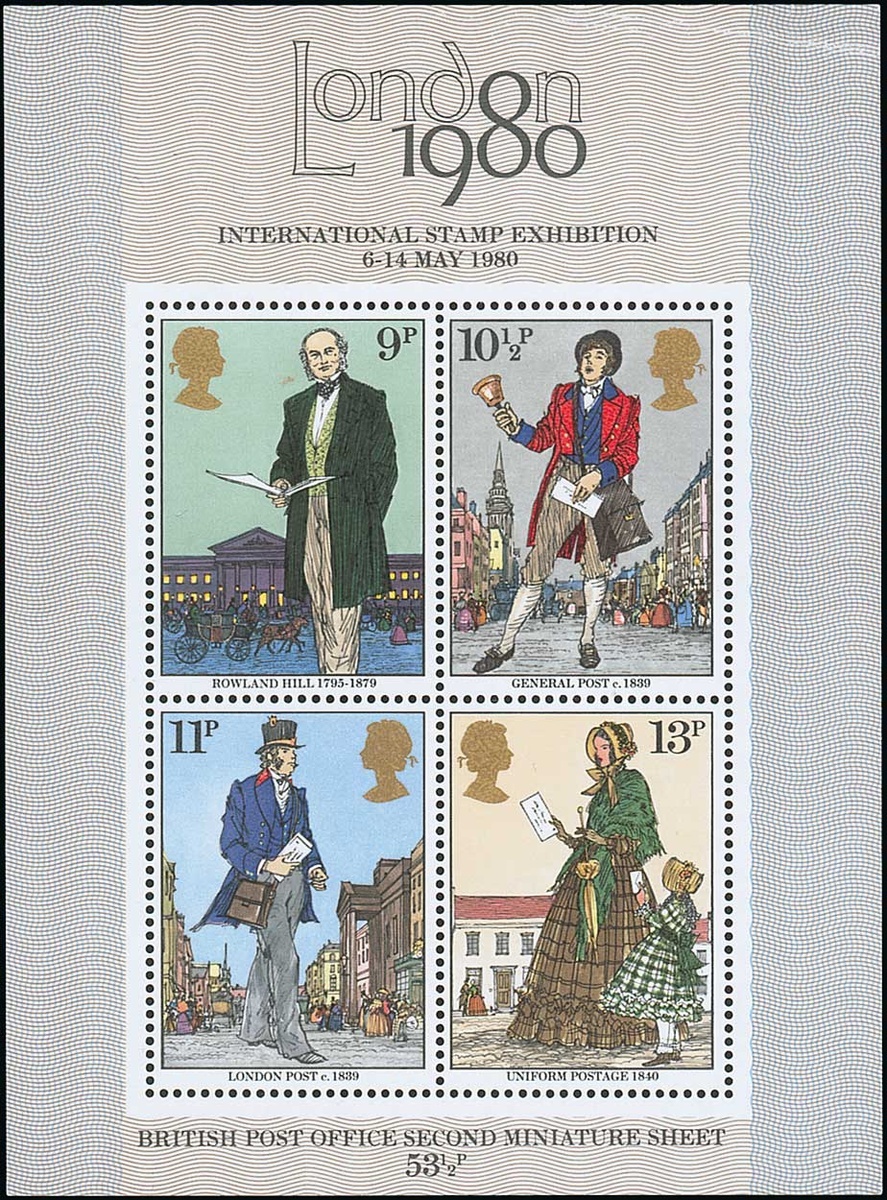 1979 Rowland Hill prepared for used but not issued miniature sheet with face values to 9p., 10½p., 11p. and 13p. with a sheet price of 53½p., unmounted mint; crease in the margin at top, otherwise fine and rare. One of only two or three known examples. Brandon Certificate (2006). Photo