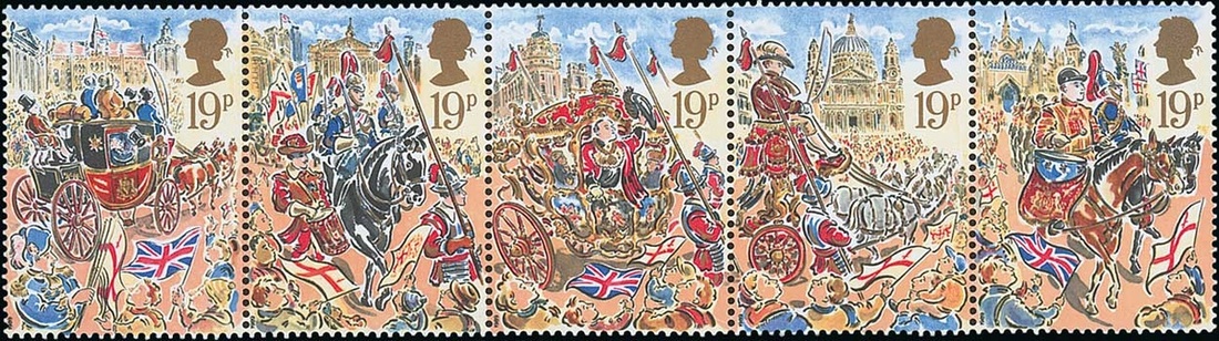 1989 Lord Mayor's Show, prepared for used though not issued se-tenant strip of five with face value 19p., original gum and offered with the Harrison and Sons presentation folder to which it was originally attached. Exceptionally rare. Only one or two strips recorded. Brandon Certificate (2007). See footnote after S.G. 1461. Photo