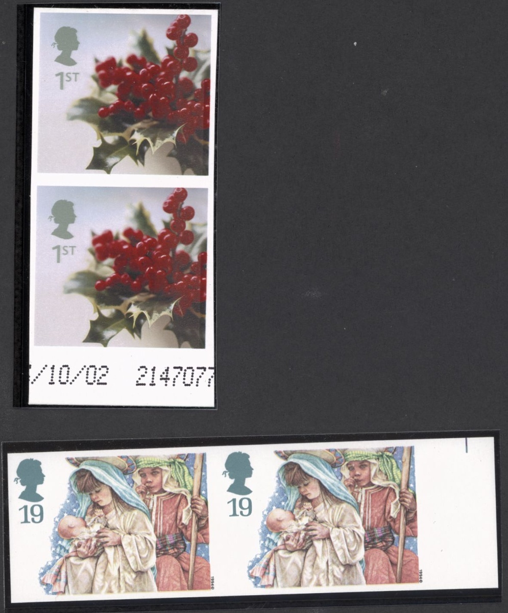 1994 Christmas, 19p. Mary and Joseph, horizontal marginal pair (unmounted mint) and 2002 Christmas 1st. vertical marginal pair (self-adhesive). both variety imperforate, fine. S.G. 1843a, 2322a, £475