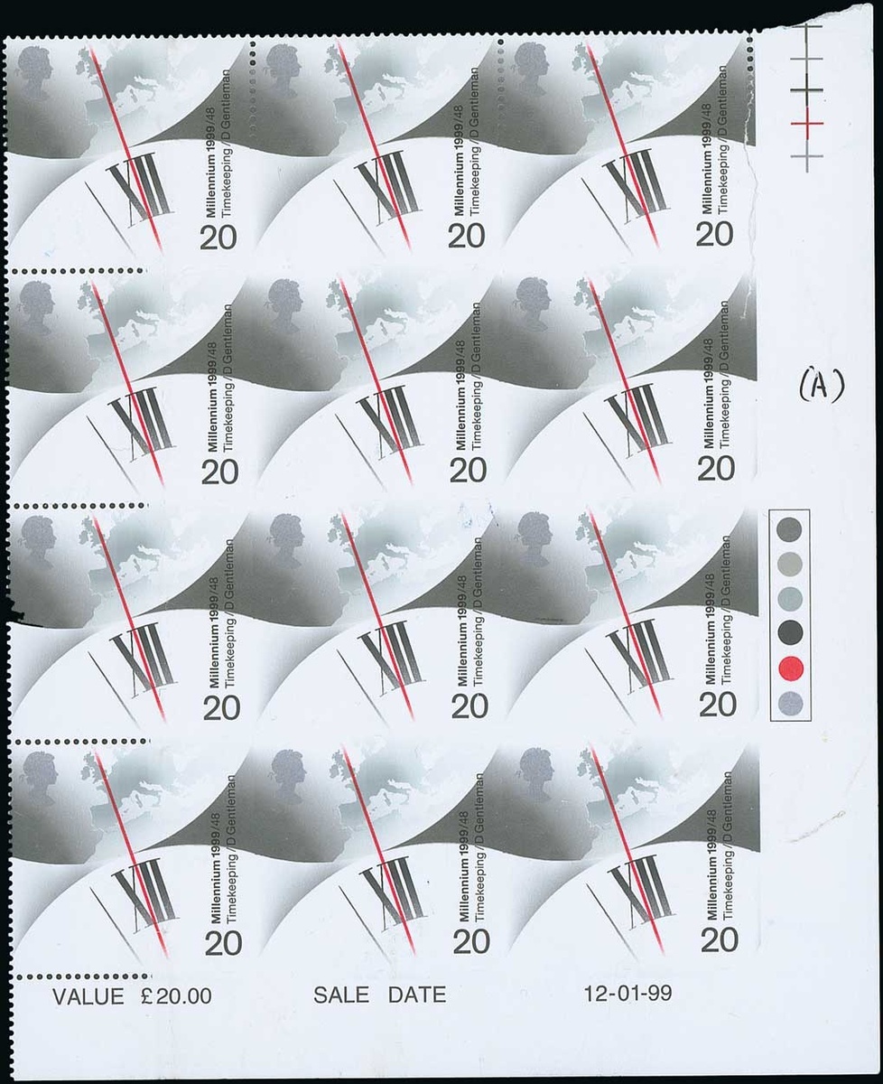 1999 20p. Greenwich Meridian block of twelve (3x4) from the lower right corner of the sheet with traffic lights, variety the corner block of four imperforate and with ghosting of perfs. affecting the remainder of the block to varying degrees, unmounted mint with creasing slightly affecting the imperforate block, a little soiled and a tear affecting two of the normal stamps. Brandon Certificate (2002). S.G. 2069a, £7,500 as a block of four. Photo