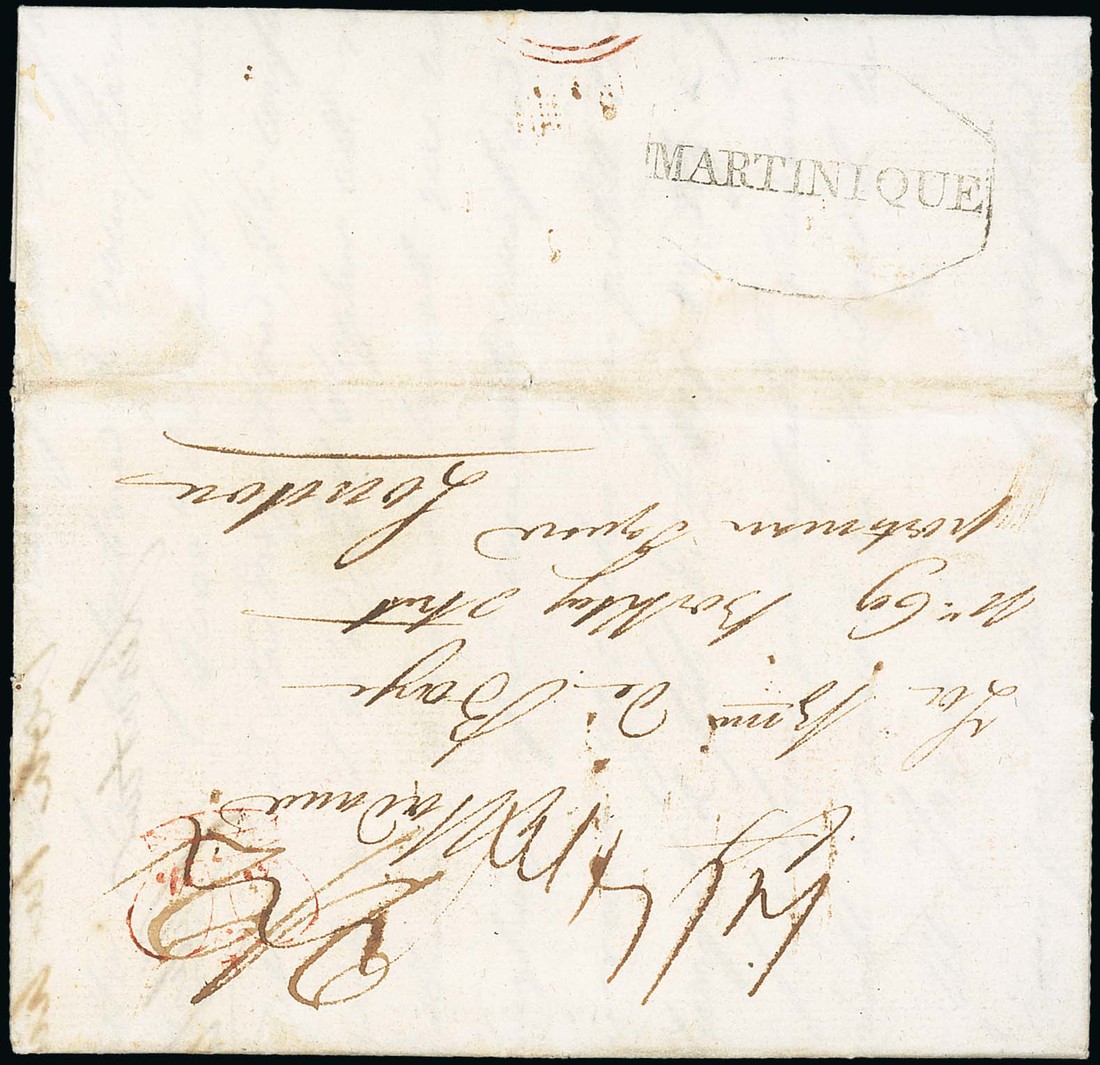 1813 (11 Dec.) entire letter from St. Lucia to London, rated "2/2" (overstruck by red Inspector's Crown) and "4/4" and showing, on reverse, fine framed
