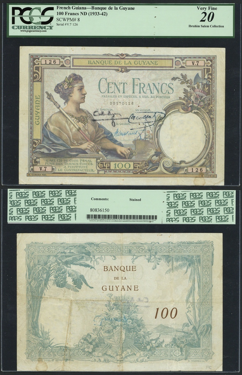 (x) French Guiana, Banque de la Guyane, 100 francs, no date (1933-1942), serial number V.7 00170126, multicolour, woman in robes holding a staff at left, watermark of a classical male bust at bottom right, 3 manuscript signatures at centre, reverse light green, fauna and flowers,