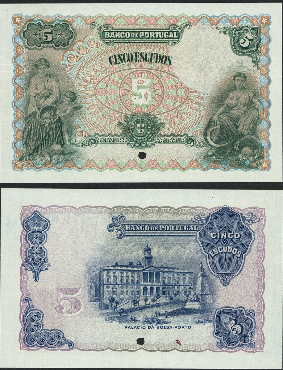 (x) Portugal, Banco de Portugal, 5 escudos, specimen/proof, without date (1924) or serial numbers, black, orange and blue, allegorical female figure with child at left, and another with a scythe at right, reverse blue and pink Palacio da Bolsa at centre, a single hole punch cancellation,